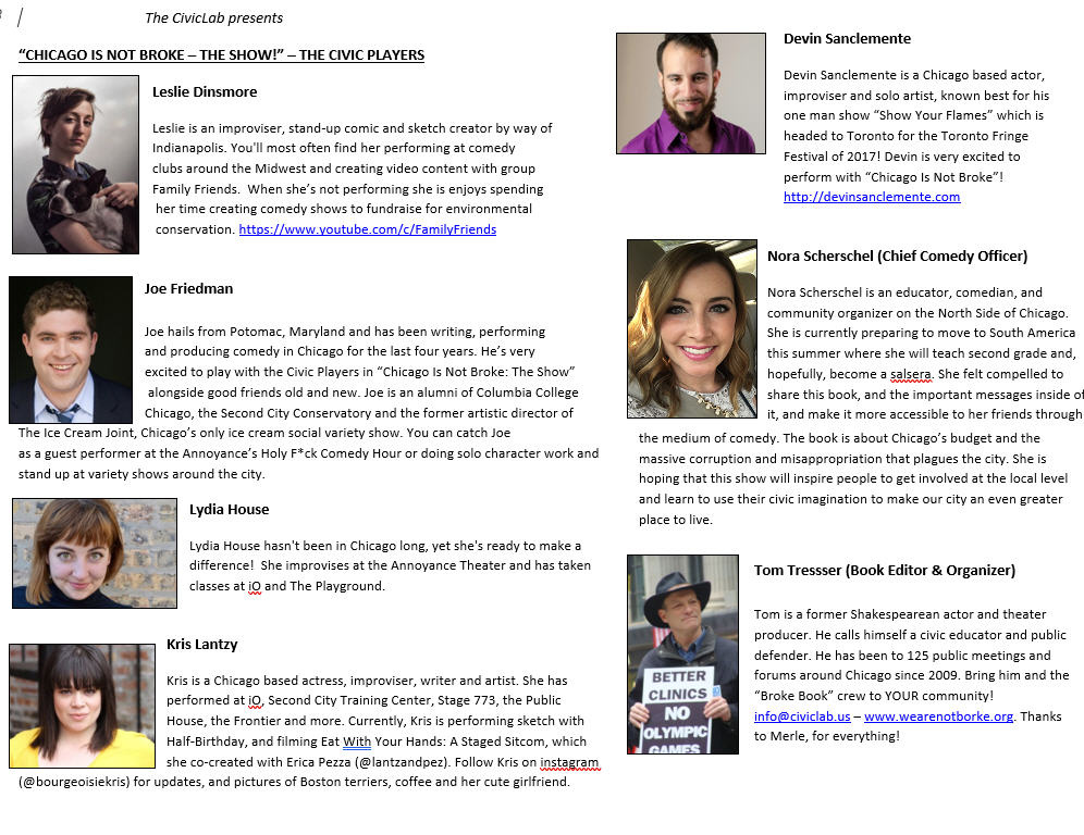 Comedy meets civics and the result was one hour of fast-paced sketches and improvisation based on the book with the answers! We did three almost sold-out shows at the Playground Theater in May of 2017.